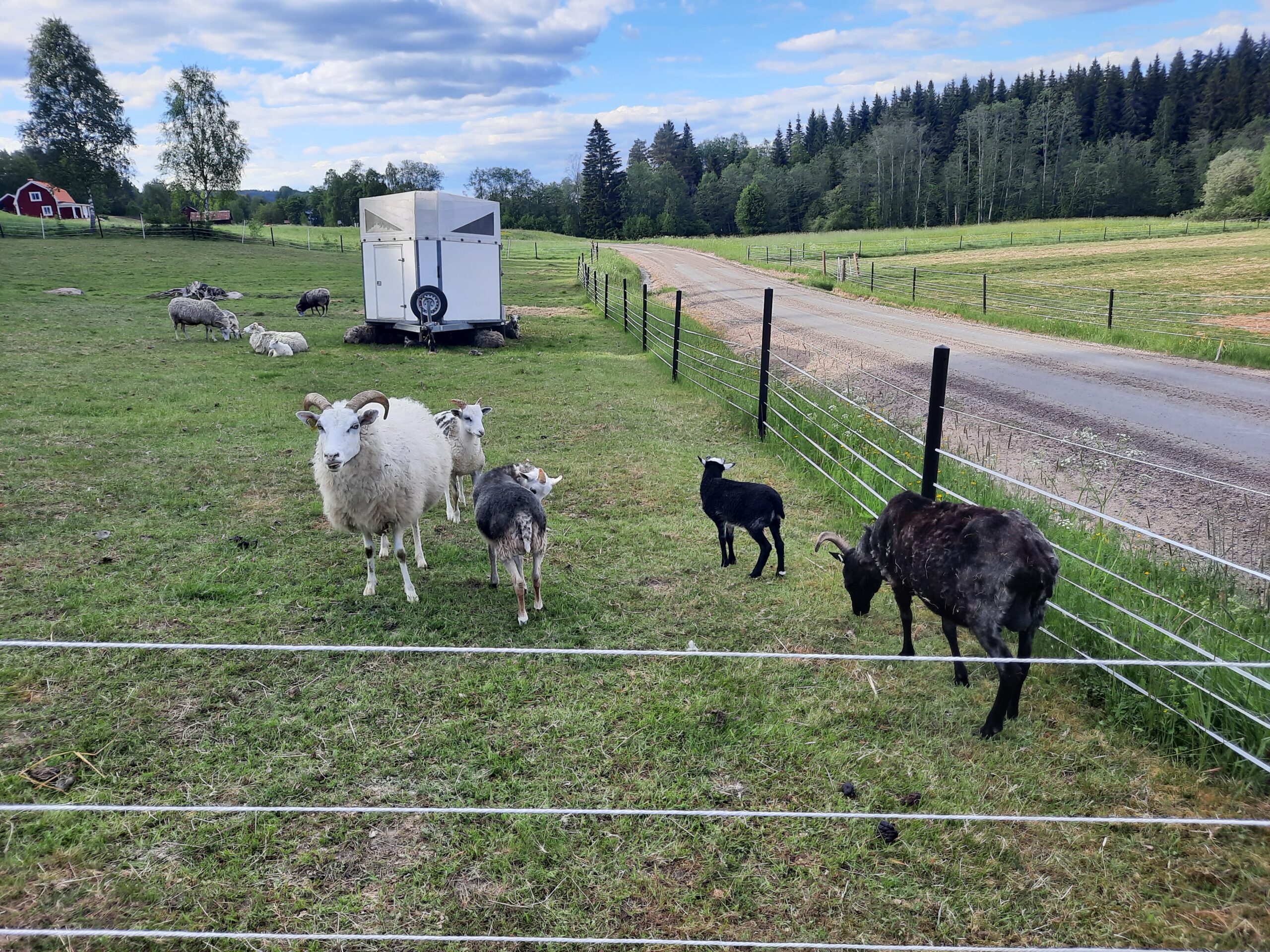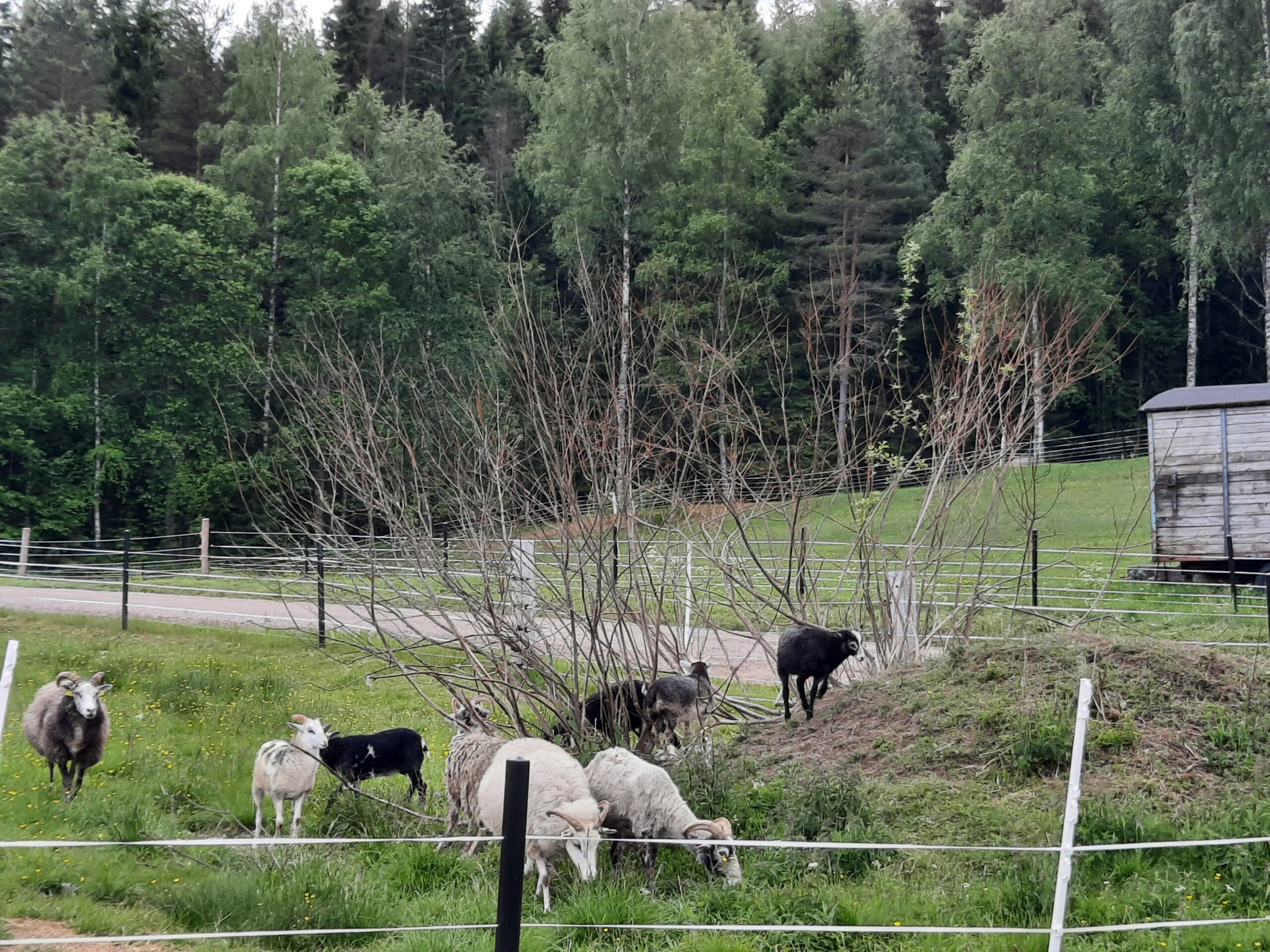 sind wir auf diesen wundervollen Hof mit Ferienhaus und Wald gezogen. Nach Renovierungs- und Verschönerungsarbeiten im Haus, begannen wir mit der Reaktivierung des Bauernhofes (gård) . Zuerst wurden Weiden eingezäunt und Mobileställe gekauft und aufgebaut. Als nächstes wurden aus dem eigenen Holz Sitzbänke für unsere Feuerstelle gebaut sowie die Heuraufen für die Schafe, die dann im Oktober 2022 als erste auf den Hof dazu kamen. Im Dezember folgten die Hühner und Plüschis.